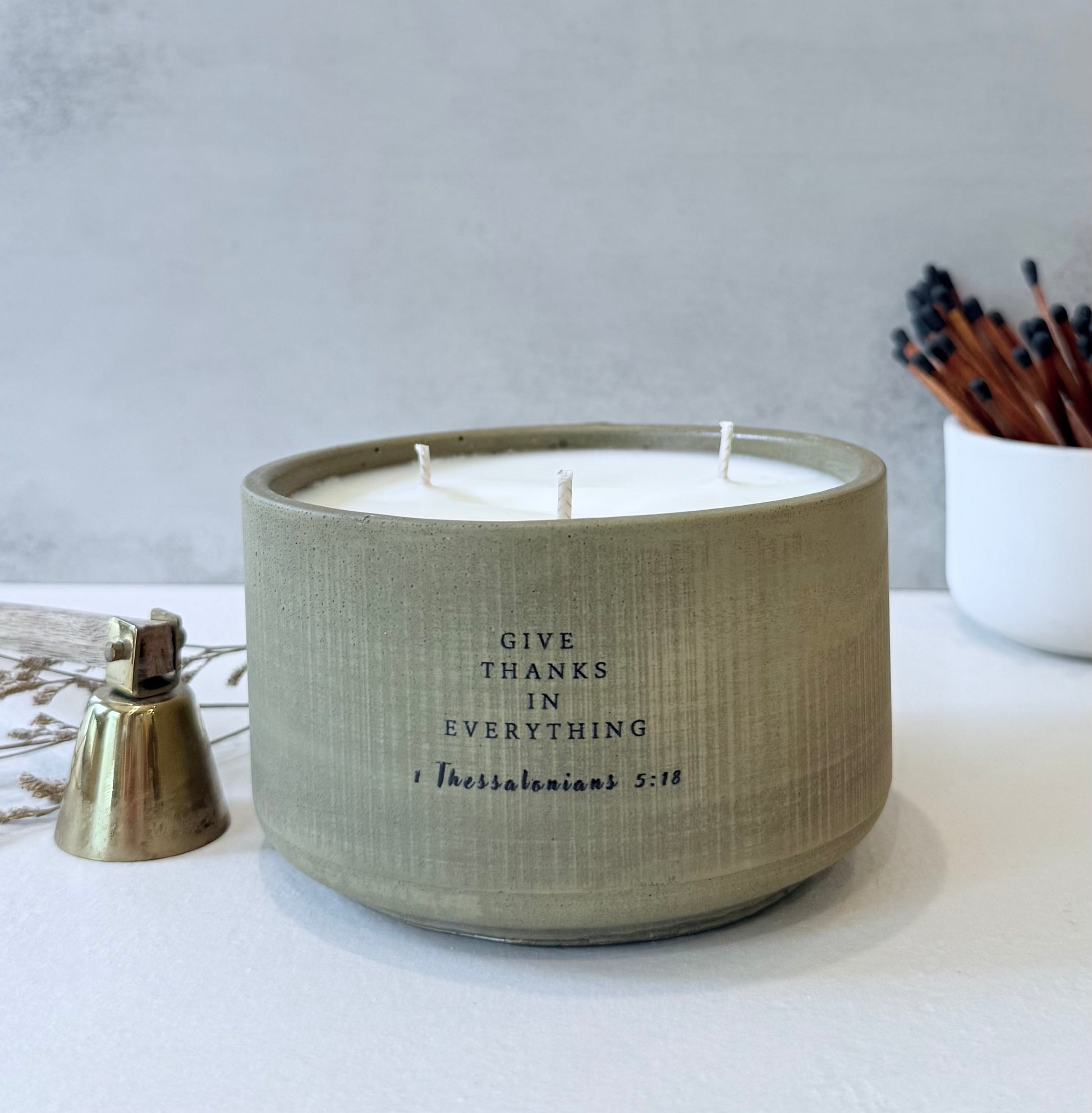 Each candle is housed in a handcrafted concrete vessel, colored with non-toxic pigments for a rustic yet refined touch. Paired with the uplifting scripture 1 Thessalonians 5:18, it serves as a heartfelt reminder to “give thanks in everything” and to embrace a spirit of gratitude in all circumstances.